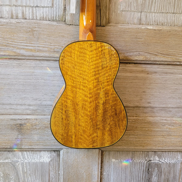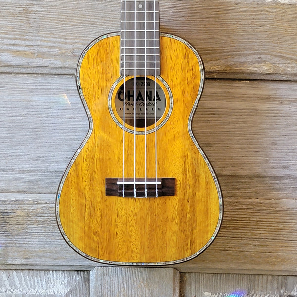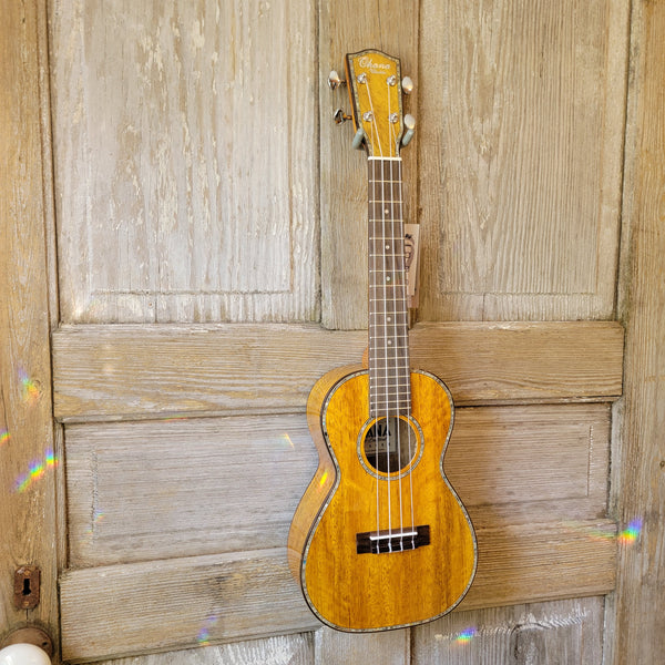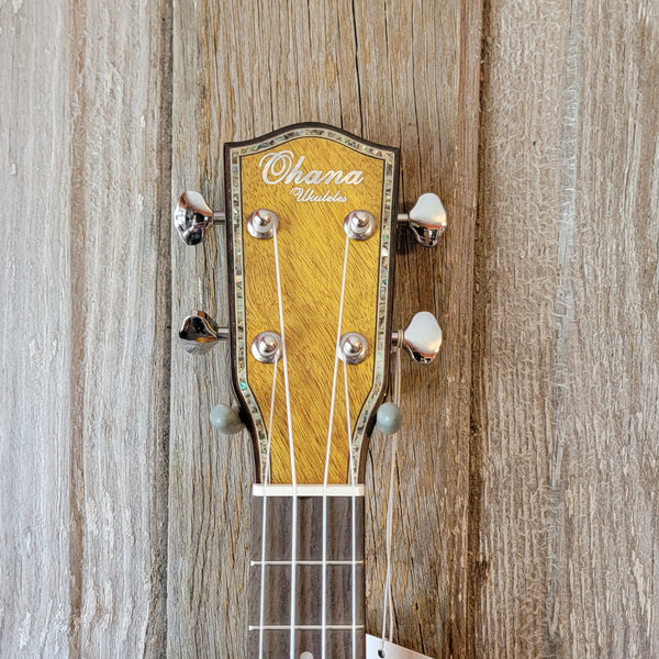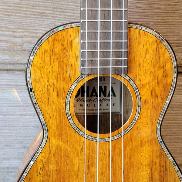 This is an older model from Ohana that was offered to me to sell because they are no longer producing this model! So here it is! The last one. I could be brought back, but as of now there is no plan to! These all solid mangos are beautiful! Each one is a unique piece of art with their spalted and/or quilted grain! The abalone detailing in the purfling and rosette add just the right amount of bling. Tonally they are not big and bold, but rather have a lovely subdued brightness with a nice mid-range tone!